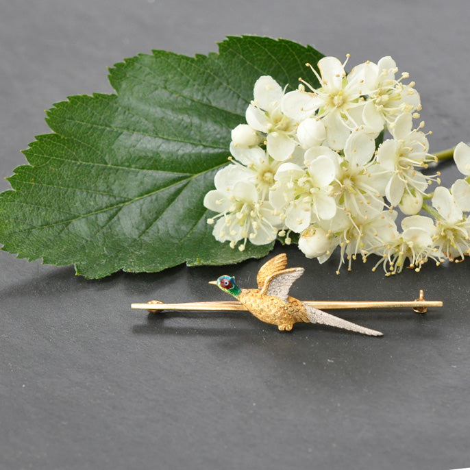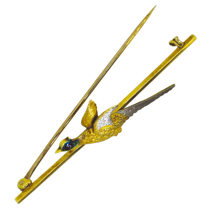 18ct Yellow, white and rose gold flying pheasant, with enamel colouring to the head. Set on a 15ct yellow gold bar, with safety catch. Beautiful textured 'feathers' in gold. Ideal stock pin or tie pin. Circa 1920s.