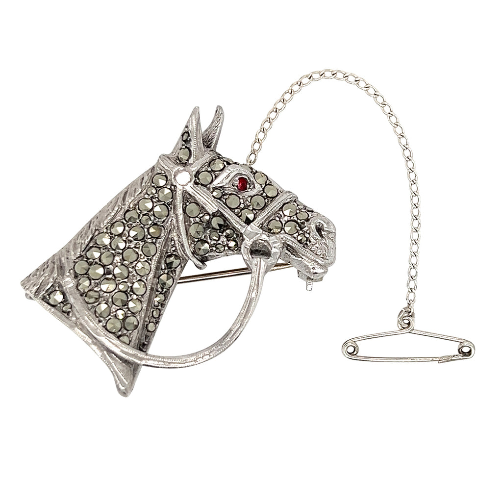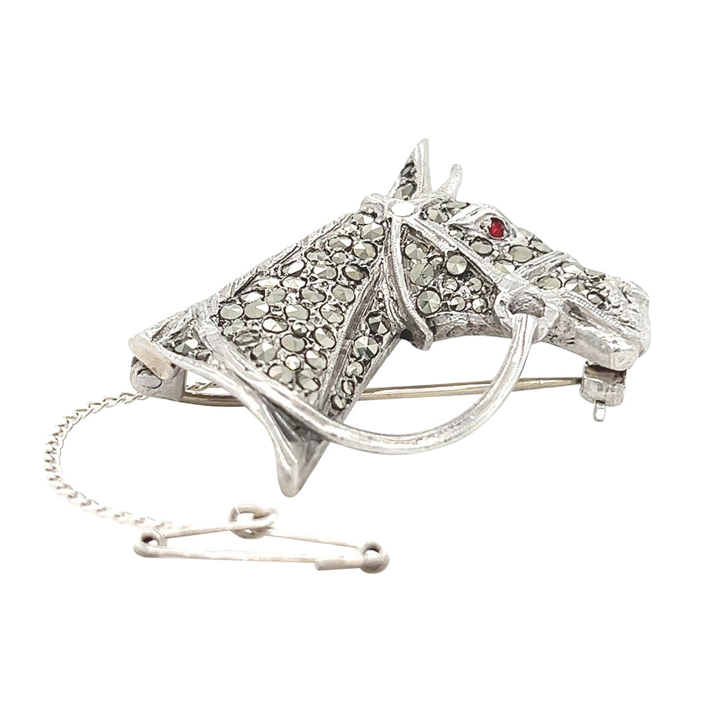 Silver marcasite set horse head brooch with safety chain. Circa 1960s.