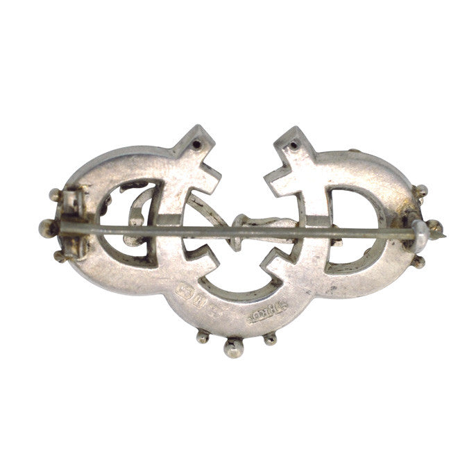 Silver fancy engraved three horse shoe brooch with whip to the centre, hallmarked silver and dated Birmingham 1889