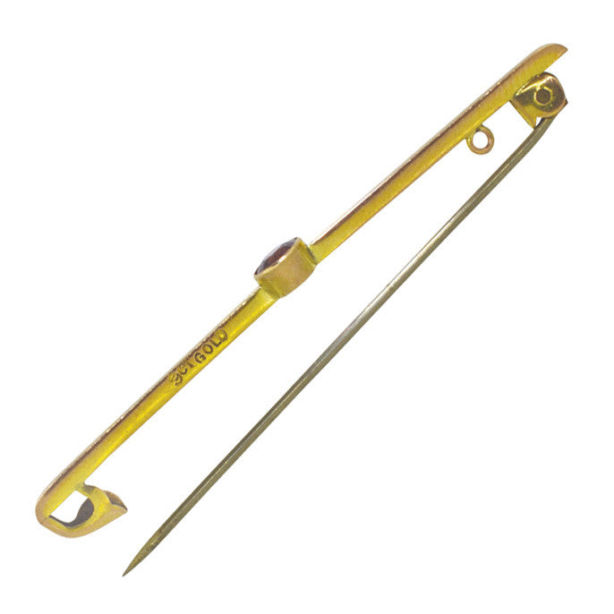 9ct Yellow gold stock pin with almandine garnet in a rub over setting to the centre. Bar tested as 9ct gold. Circa 1930s.