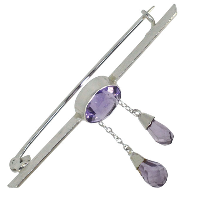 Silver and amethyst stock pin. A single round amethyst in a rub over setting, set to the centre of a plain silver bar, with two amethyst drops. Circa 1920s.