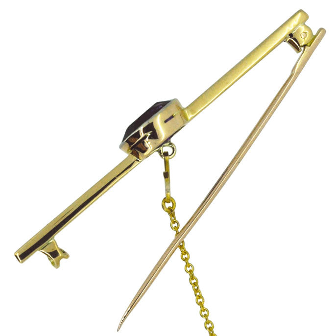 Edwardian 15ct yellow and white gold bar with a single oval amethyst set to the centre in a rub over setting. With removable safety chain. Circa 1910.