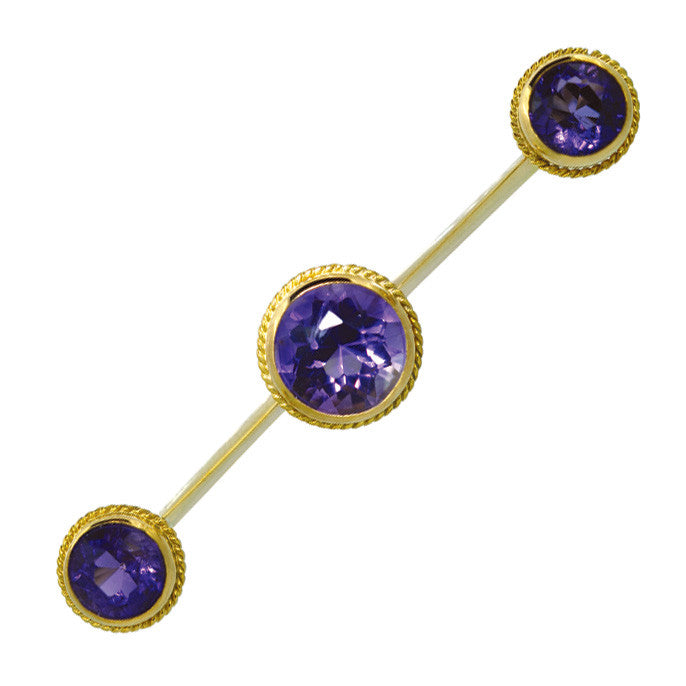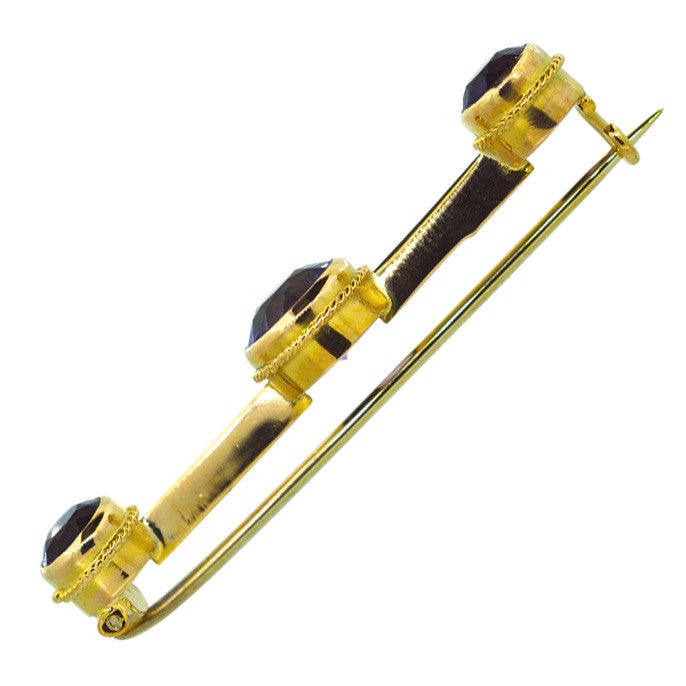 9 Carat plain gold bar with three amethyst with rope edge settings, set to the centre and to each end of the bar. Tested with acid as 9 carat gold, circa 1920's.