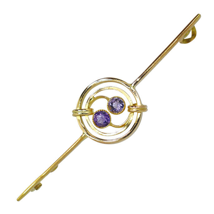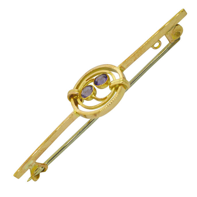 Stock Pin set to centre with two amethyst, tested with acid as 9ct yellow gold with a metal pin circa 1930's