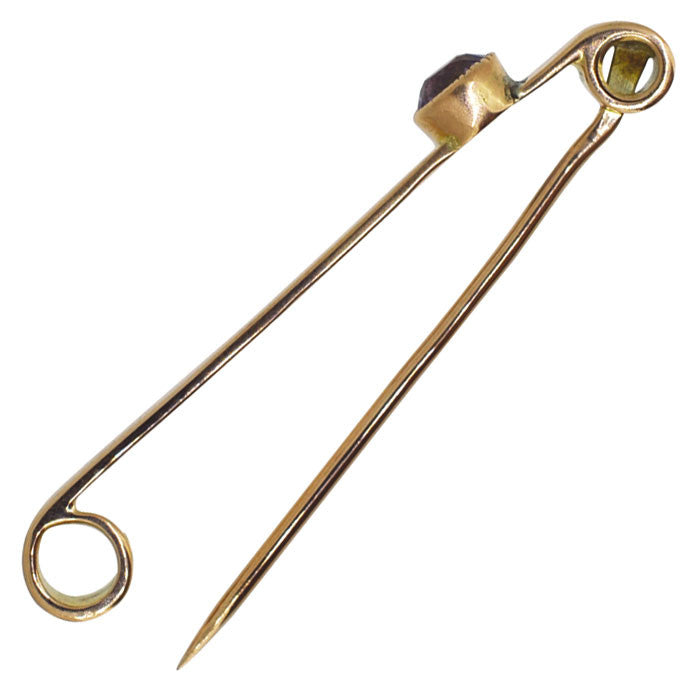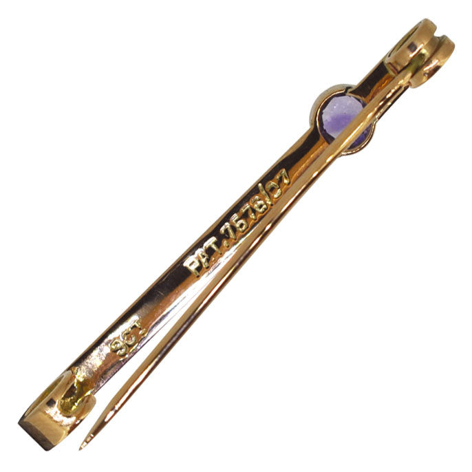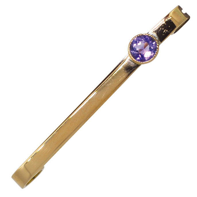 Rose gold amethyst bar with a single amethyst set to one end in a rub over setting. Tested with acid as 9ct yellow gold and marked '9ct', Circa 1930.