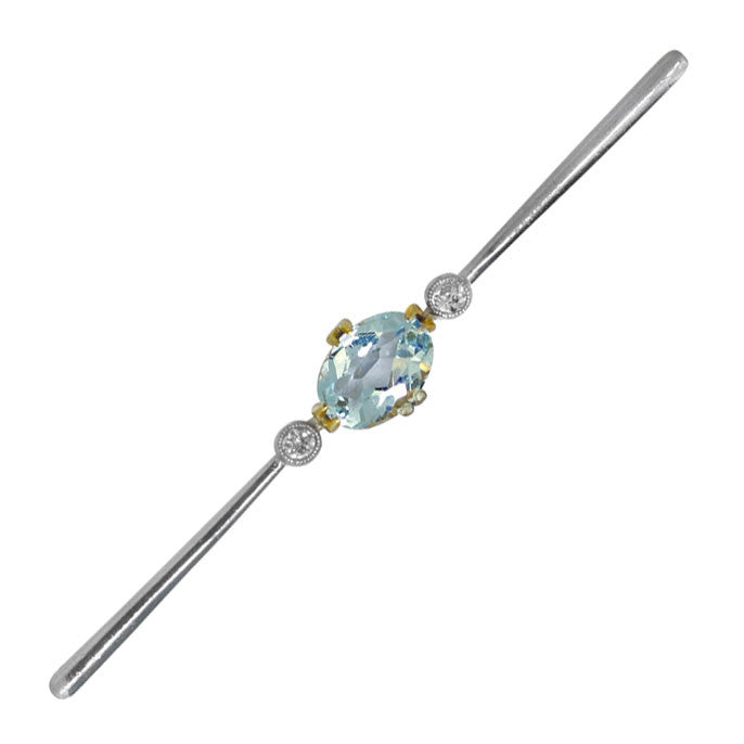 Oval aquamarine (apron 1.50 cts) with 2 diamonds (aprox 0.10cts) set to the shoulders of the aquamarine in a rub over settings. Bar tested as 15ct yellow and white gold. Circa 1930s.