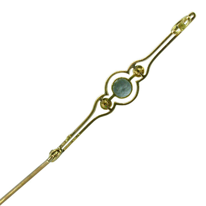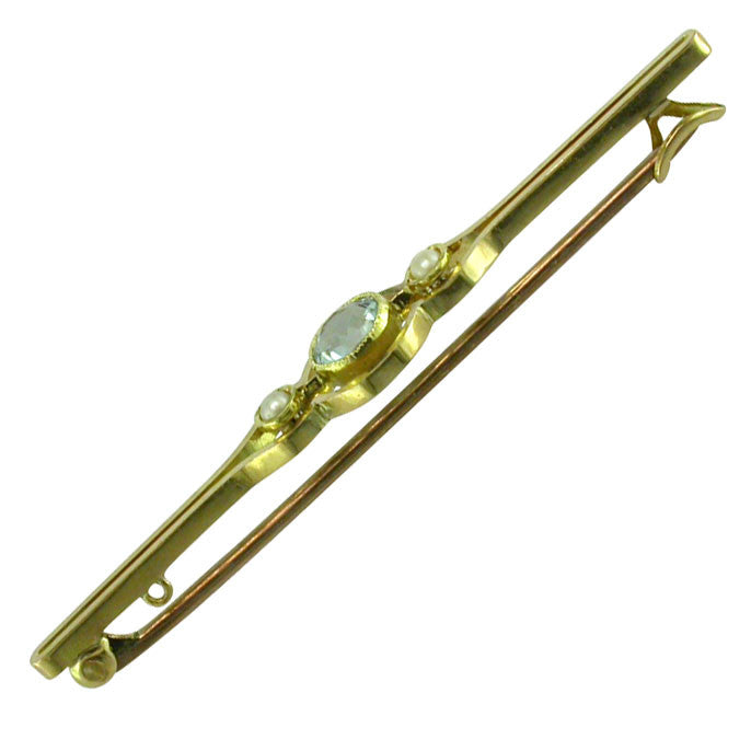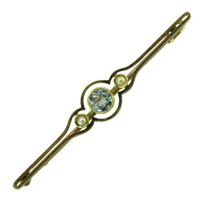 Set with a single round aquamarine to the centre and a pearl each side, tested with acid and marked as '15ct'