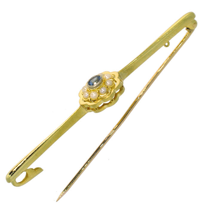 Stock Pin in the form of a plain bar rub-over set to the centre with a cluster of pearls surrounding a sapphire, tested with acid as 15ct yellow gold, circa 1910