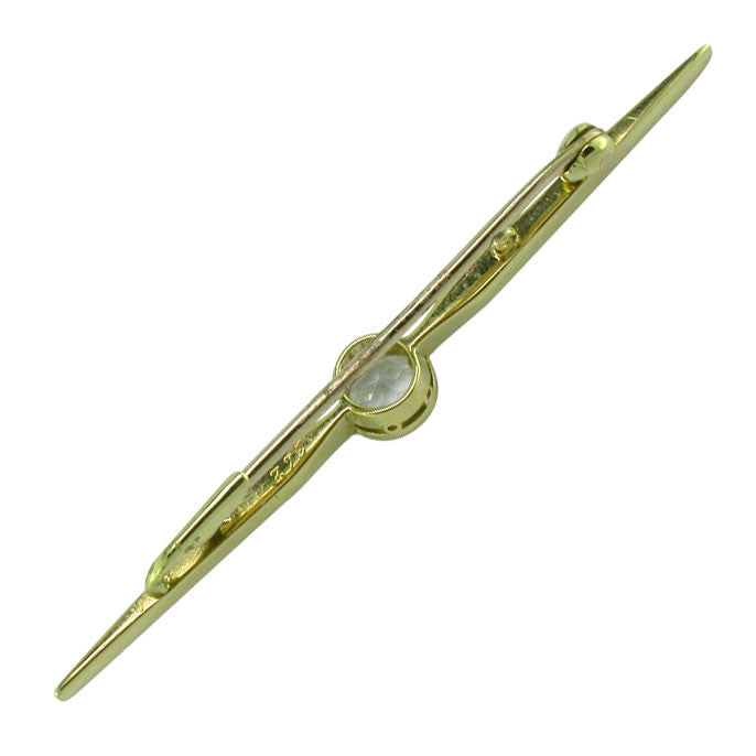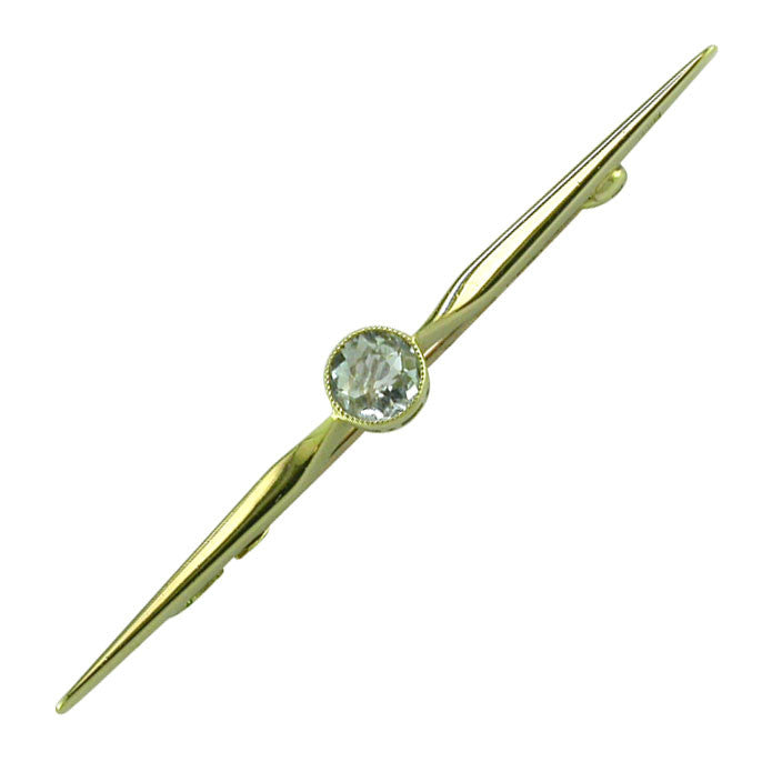 Stock Pin set to the centre with a single round aquamarine, marked '15ct' and tested with acid as 15ct yellow gold, circa 1910