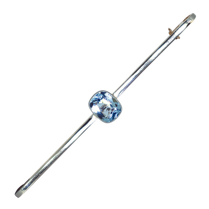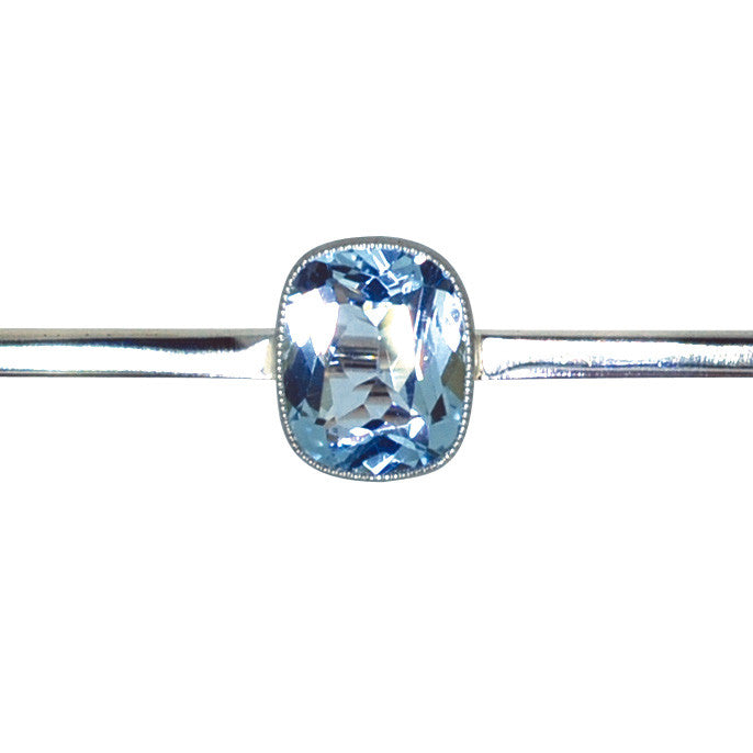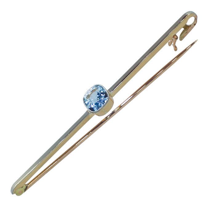 Stock Pin a plain bar with a single cushion shaped aquamarine in a rub-over setting to the centre, marked '15ct PLAT' and tested with acid as 15ct yellow gold and platinum, circa 1920's with safety catch