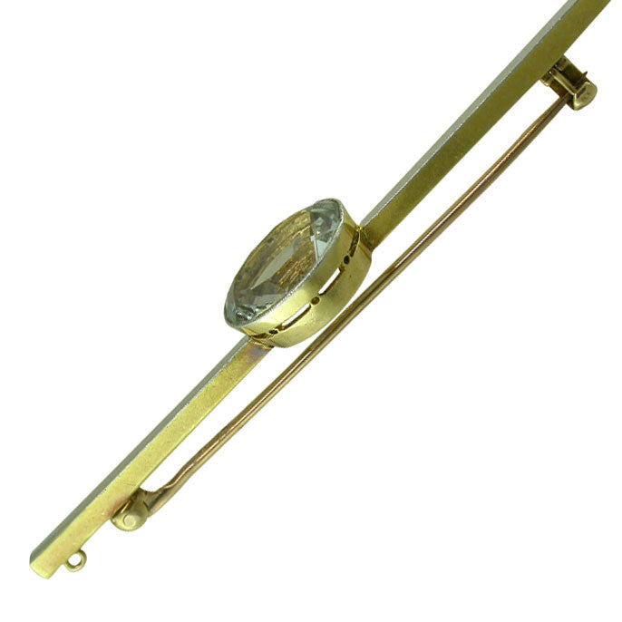 Aquamarine stock pin. Tested with acid as 15ct, plain bar set to the centre with a single aquamarine (apps. 10mm x 12mm), circa 1930, with safety catch.