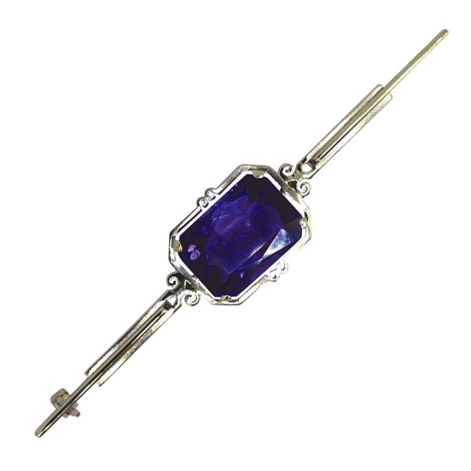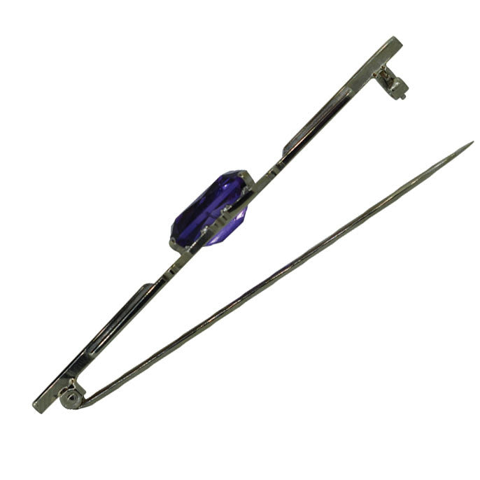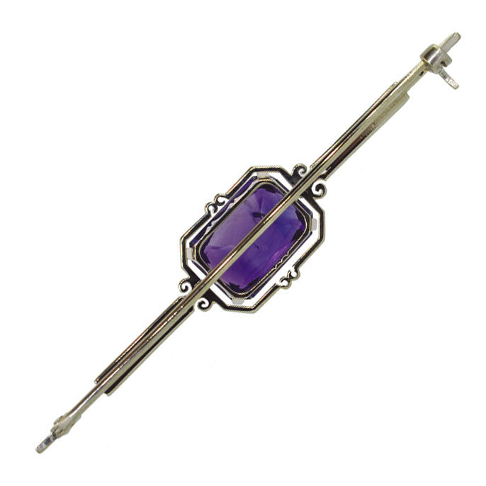 Stock pin set to with an emerald cut, rich purple amethyst stone to the centre of a fancy art deco bar , tested with acid as 9ct white gold and marked '9ct' circa 1930's with safety catch to pin.