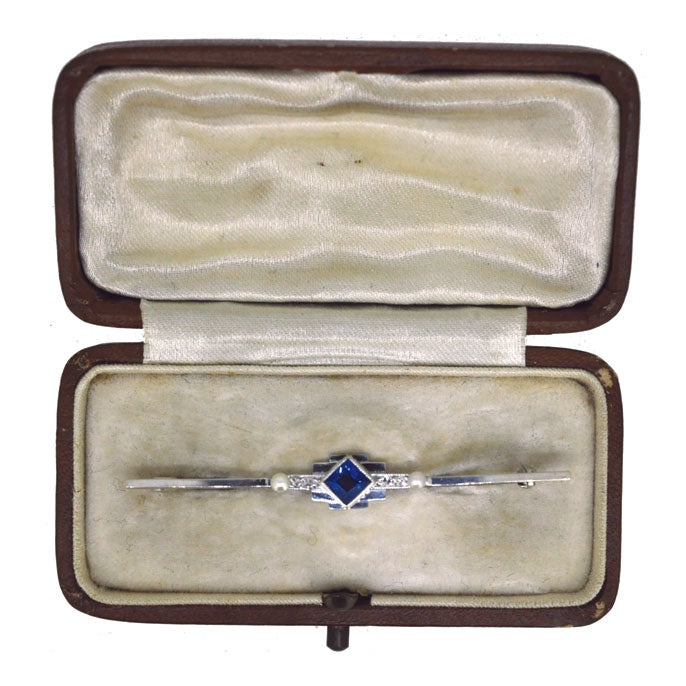 15ct White gold Art Deco bar with a single square sapphire set to the centre with a pearl to each side. Circa 1930s, with safety catch. In old box.