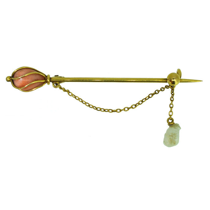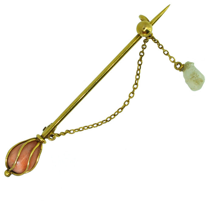 Arts & Crafts Movement coral and pearl stock pin. Unusual stock pin with a coral to one end of a gold bar, and a single pearl suspended from a chain to the other. A fabulous conversation piece, tested with acid as 15ct yellow gold and marked '15',  Circa 1910.