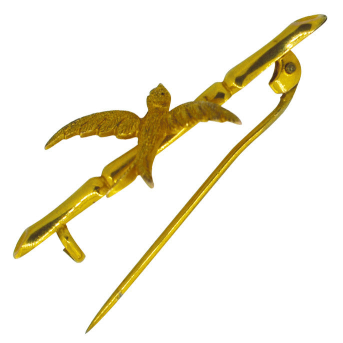 9ct gold swallow on a bamboo cane. Rich textured finish to the body of the swallow, Hallmarked Birmingham 1908.