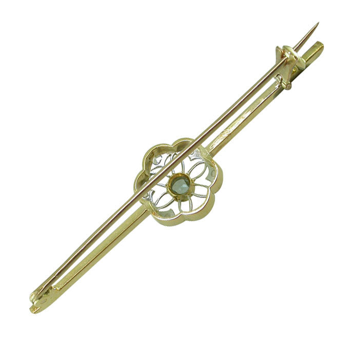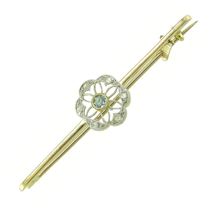 Yellow and white metal tested with acid as '18ct' set with six rose cut diamonds and aquamarine to the centre. With safety catch.
