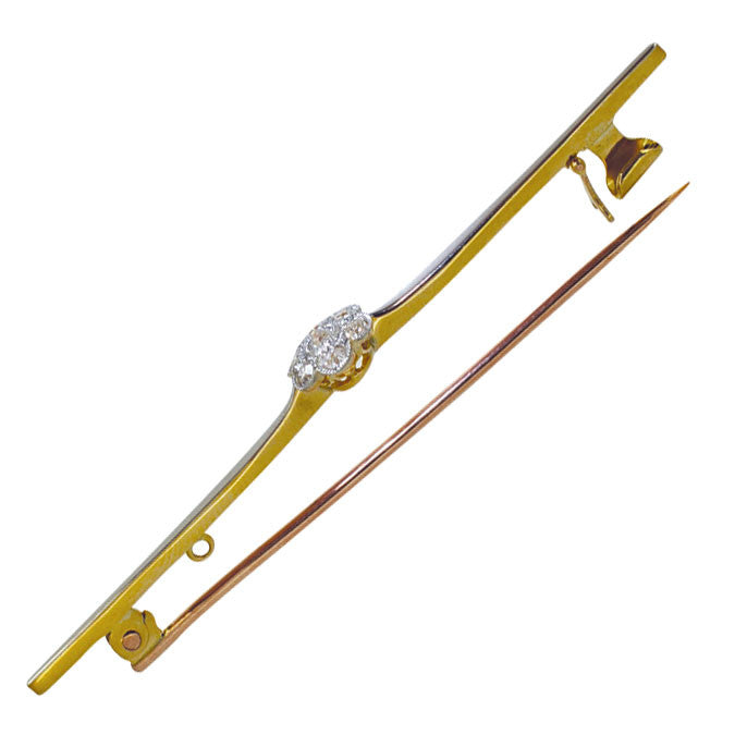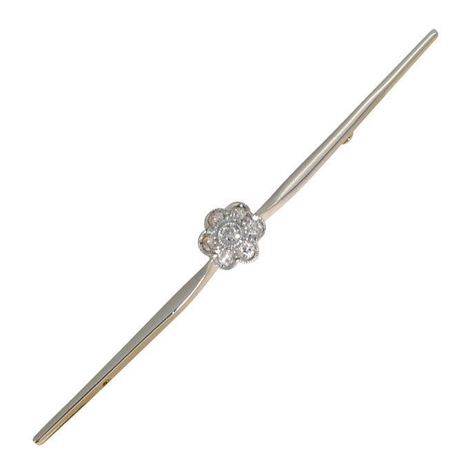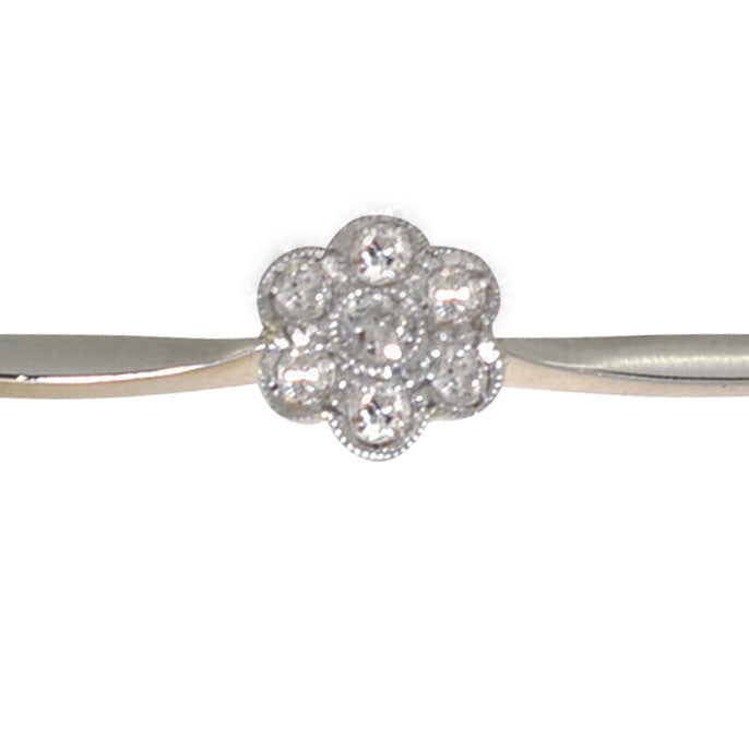 Diamond Stock Pin, a plain bar with a cluster of seven diamonds to the centre arranged in a daisy shape. Tested as 18ct yellow and white gold, with a safety catch. Circa 1920s.