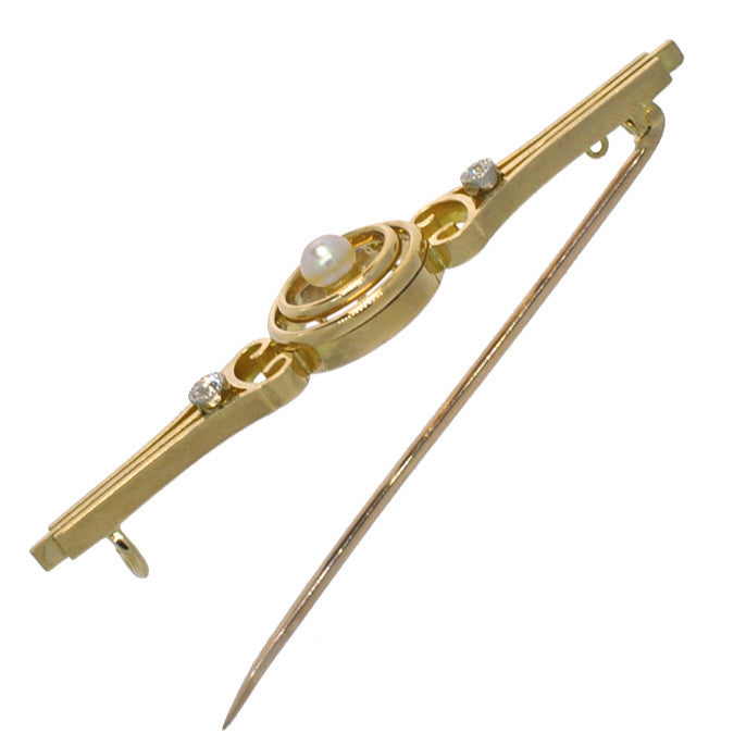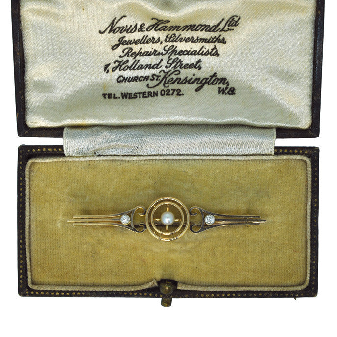Stock pin with a pearl set to the centre and a diamond to each side , tested with acid as 15ct yellow gold, circa 1930s. In an original old box.