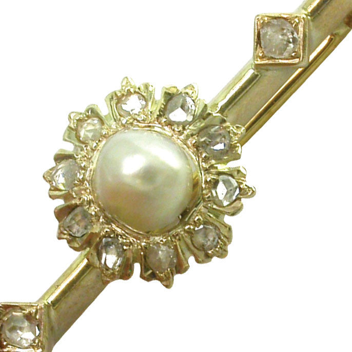 Diamond and Cultured Pearl stock pin, with a cluster to centre set with a single cultured pearl surrounded by ten rose diamonds, with a rose diamond to each side, tested with acid as 18ct yellow gold, circa 1900