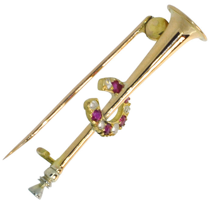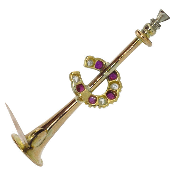 Stock Pin in the form of a hunting horn with a diamond and ruby set horseshoe to the centre, tested with acid as 15ct yellow gold, the pin as 9ct yellow gold, circa 1880