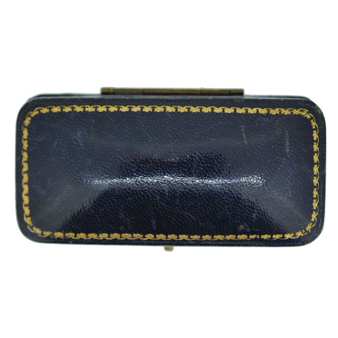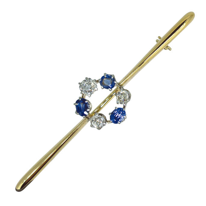 Three diamonds and three sapphires claw set alternately in platinum, in a circle on a gold bar with safety catch. Circa 1930s in original old box.