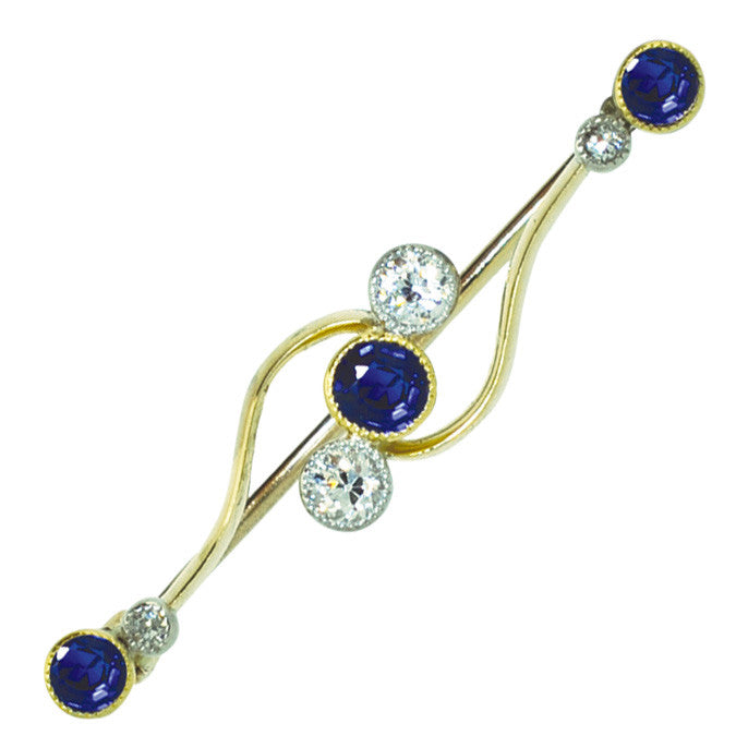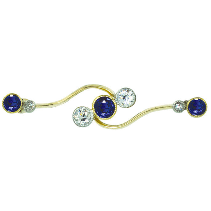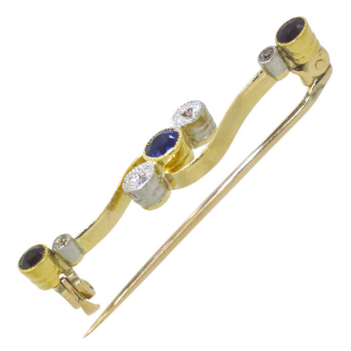 A cross over bar with diamonds and sapphires set to the centre and each end of the bar in a rub over settings. Tested as 15ct yellow gold and 15ct white gold. Diamond total weight approximately 0.2 cts. Circa 1930s.
