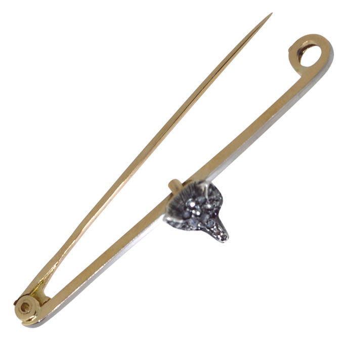 Victorian diamond set fox head stock pin with ruby eyes. Plain bar tested as 15ct rose gold with white gold onlay. Silver fox head set with diamonds and ruby eyes. Circa 1880.