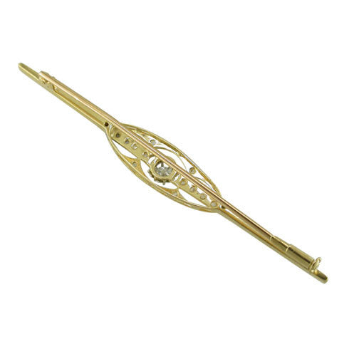 Stock Pin set to the centre with single Edwardian cut diamond (appx 0.12cts) with fourteen rose cut diamonds along bar. Tested with acid as yellow and white 18ct gold. circa 1890.