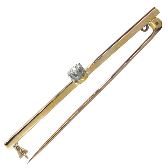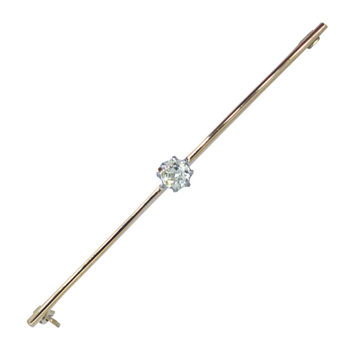 Edwardian 15ct Rose and white gold bar with a single Victorian cut diamond set to the centre in a claw setting. Diamond appx 0.20 cts, colour J/R, clarity SI. With safety catch.