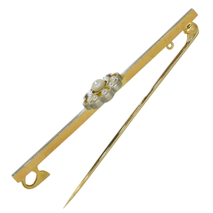 Edwardian rose gold and white gold bar with a nine pearl cluster to the centre. Circa 1910. In old box.
