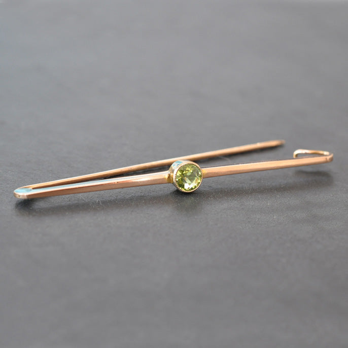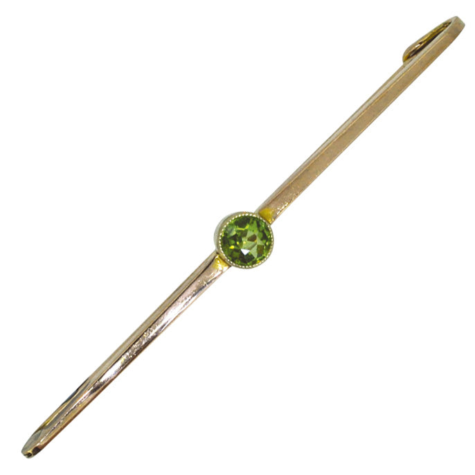 Edwardian 9ct rose gold bar with a single round peridot set to the centre, in a rub over setting. Circa 1910.