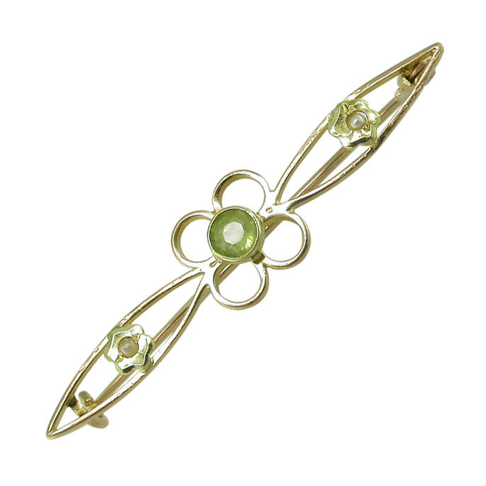 Edwardian peridot and pearl set stock pin. Tested with acid and marked as '15ct', circa 1910.