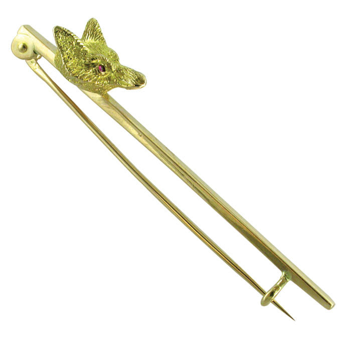Fox Head stock pin, the foxes eyes set with rubies, on a plain bar tested with acid as 9ct rose coloured gold, circa 1930's