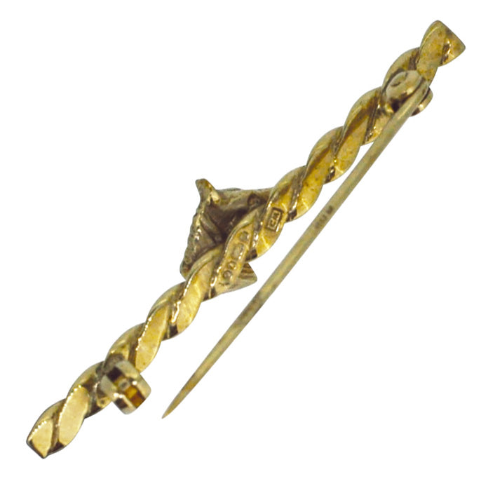 9ct Yellow gold 'twist' bar with a horse head set to the centre. with safety catch. Hallmarked and dated London 1989.