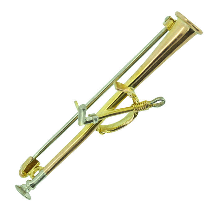 Hunting Stock Pin in the form of a hunting horn with a horseshoe and whip to the centre, tested with acid as 9ct yellow and white gold and marked '9ct', circa 1920's