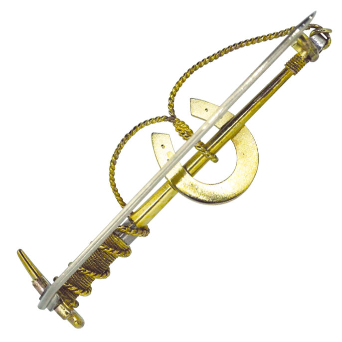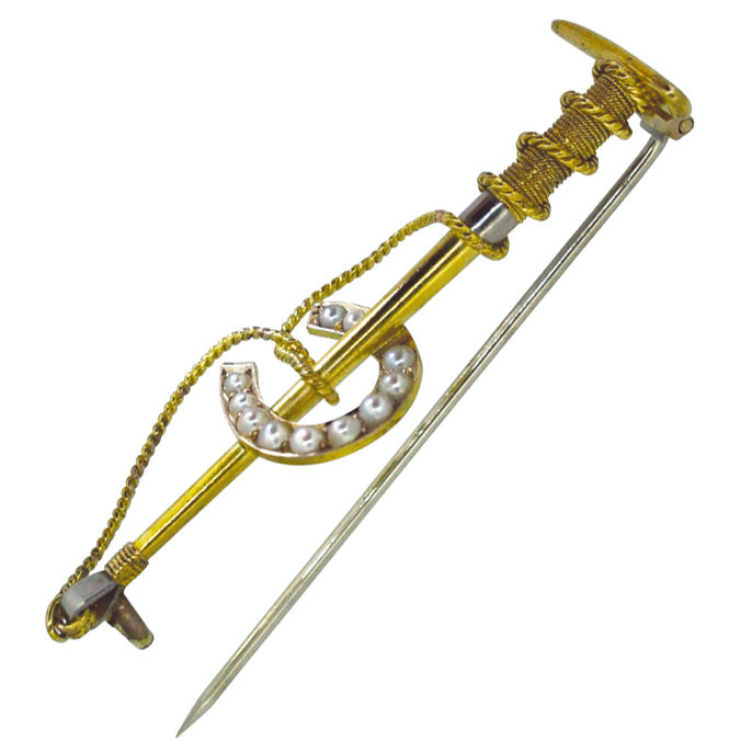 15ct Yellow and white gold hunting whip with a horse shoe set with eleven seed pearls. Circa 1930s.
