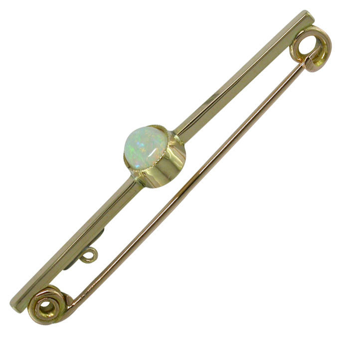 Opal Stock Pin tested with acid and marked as '9ct' rose coloured gold, set to centre of a plain bar with an opal circa 1930's