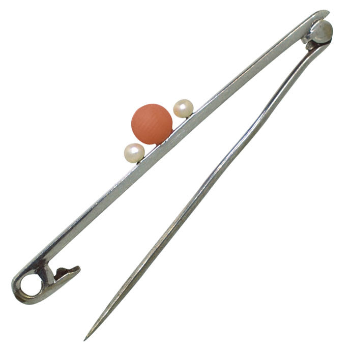 9ct White gold bar with a coral set to the centre and a seed pearl each side. Tested as 9ct gold, circa 1920s.