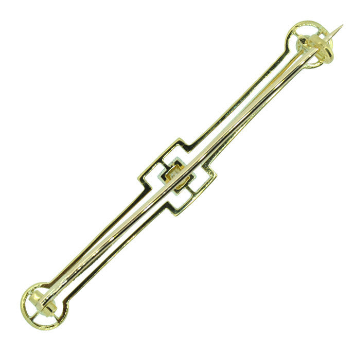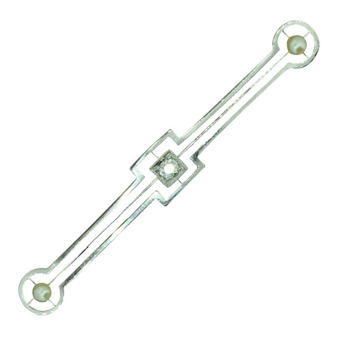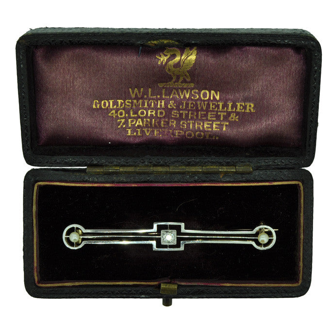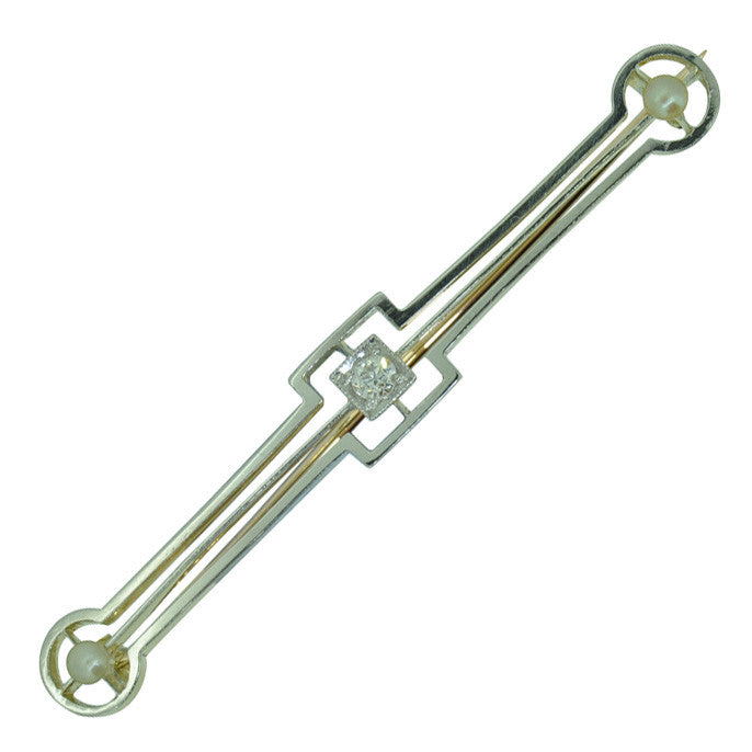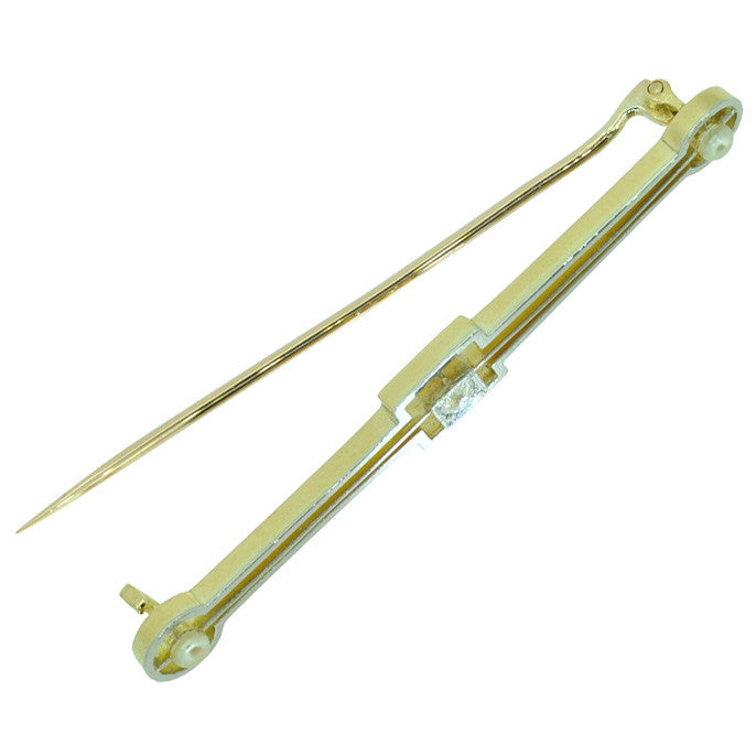 Stock Pin set to centre with a single diamond, with a pearl on each end, tested with acid as 15ct yellow and white gold, circa 1930's, in original old box