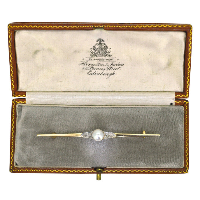 Edwardian 15ct Yellow and white gold bar with a single pearl set to the centre and 2 rose cut diamonds to each side (4 rose cut diamonds in total). Circa 1910. In old box.