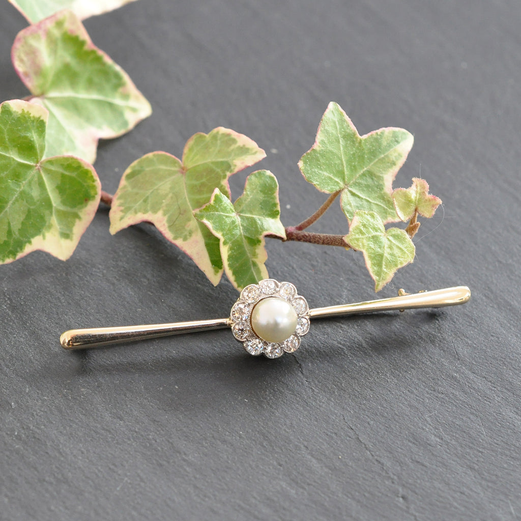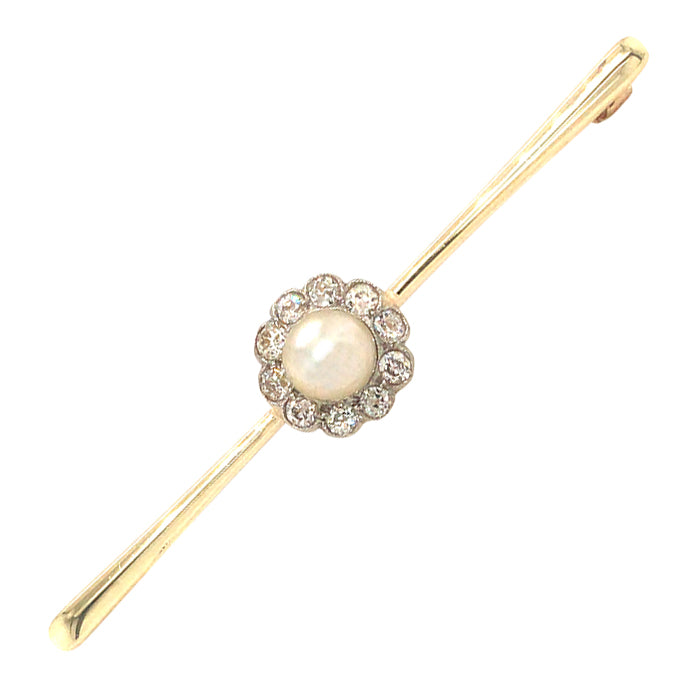 Yellow and white gold bar with a single cultured pearl set the the centre, surrounded by ten diamonds. Diamond weight approximately .70 cts, colour I, clarity SI1. In old box.