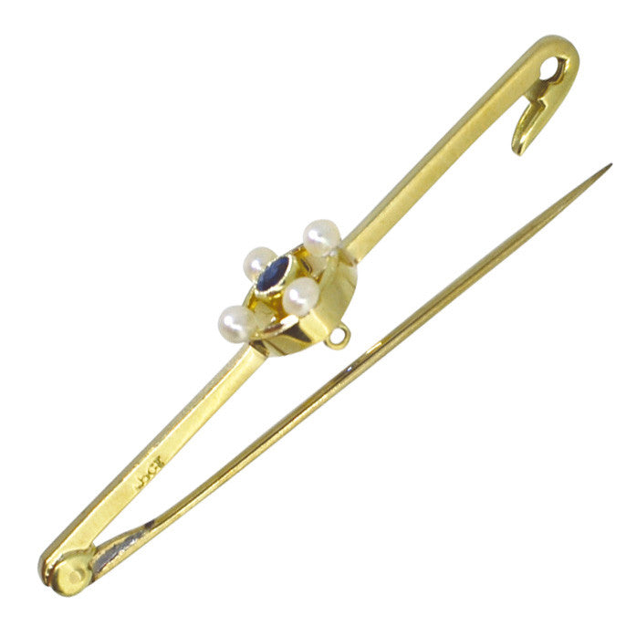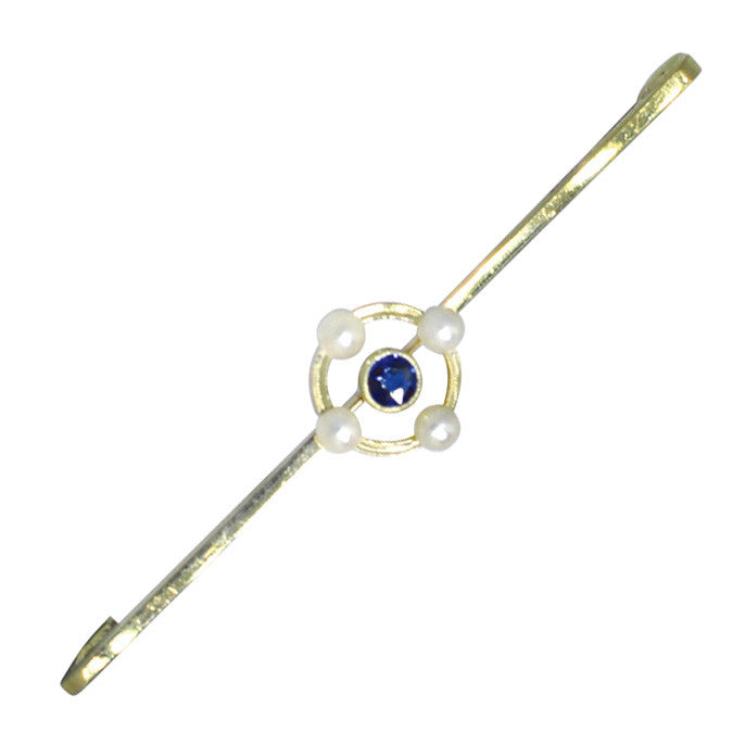 15ct Yellow gold bar with a single sapphire to the centre in a rub over setting, surrounded by a gold circle and four seed pearls. Circa 1920s.