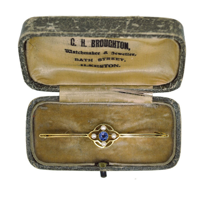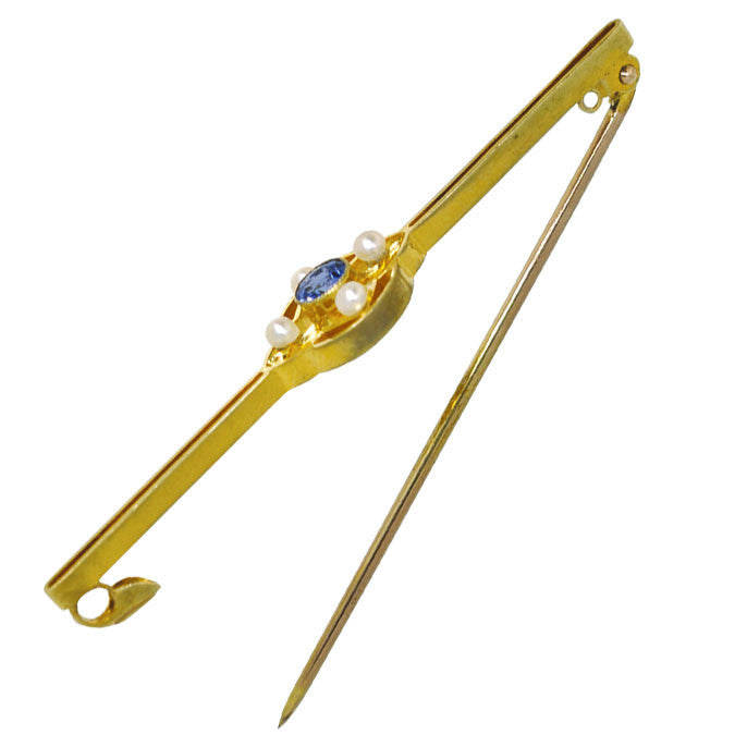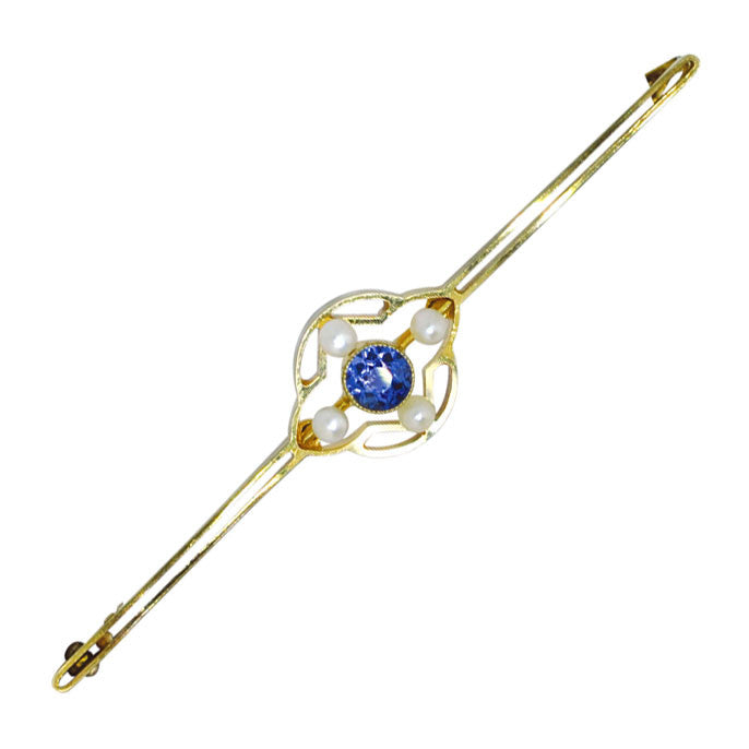 A fancy 15ct yellow gold bar with a single sapphire set to the centre in a rub over setting. Four seed pearls set around the sapphire. Tested as 15ct gold, circa 1930s. In old box.