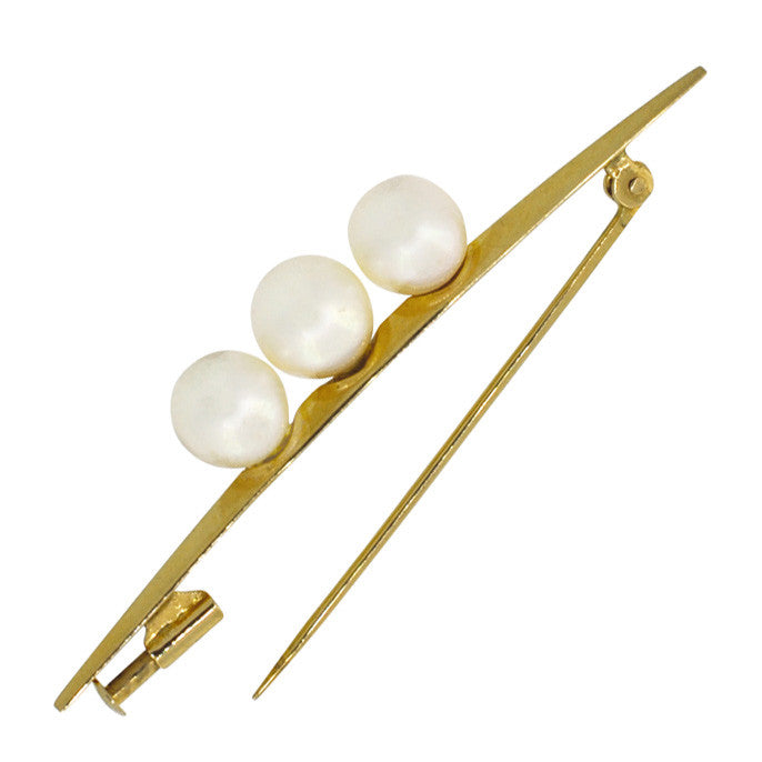 14ct Yellow gold stock pin with three cultured pearls set to the centre. Tested as 14ct yellow gold. Pearls measure 7 & 7.4 mm diameter. Bar with safety catch.