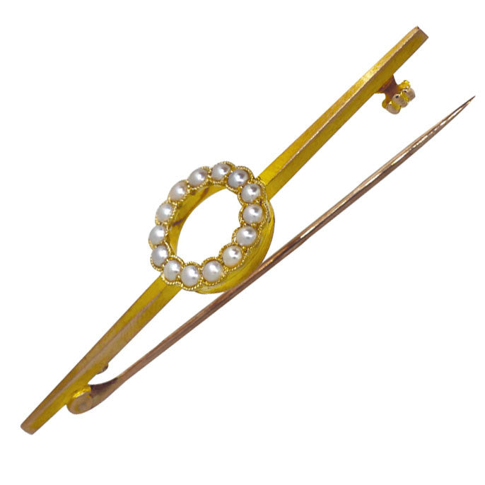 15ct Edwardian yellow gold bar with fourteen pearls set in a circle to the centre of the bar with a scalloped edge. Tested as 15ct gold.