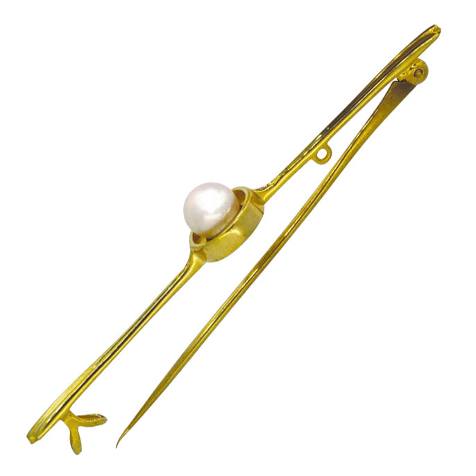 9ct yellow goId stock pin with a single cultured pearl set to the centre. Circa 1930s.
