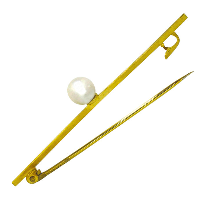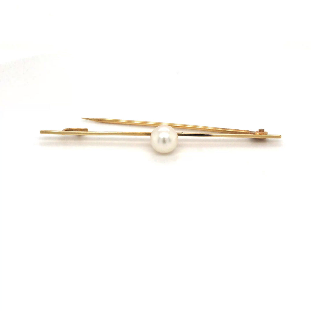 9ct Yellow gold bar with a single cultured pearl set to the centre. Circa 1960s.