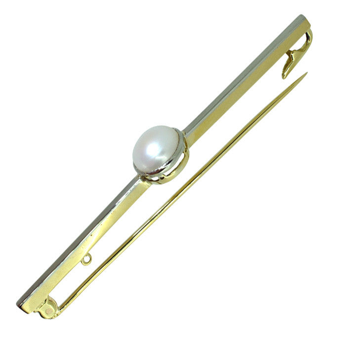 Pearl Stock Pin, a plain bar tested with acid as 15ct yellow and white gold, marked '15', circa 1930's