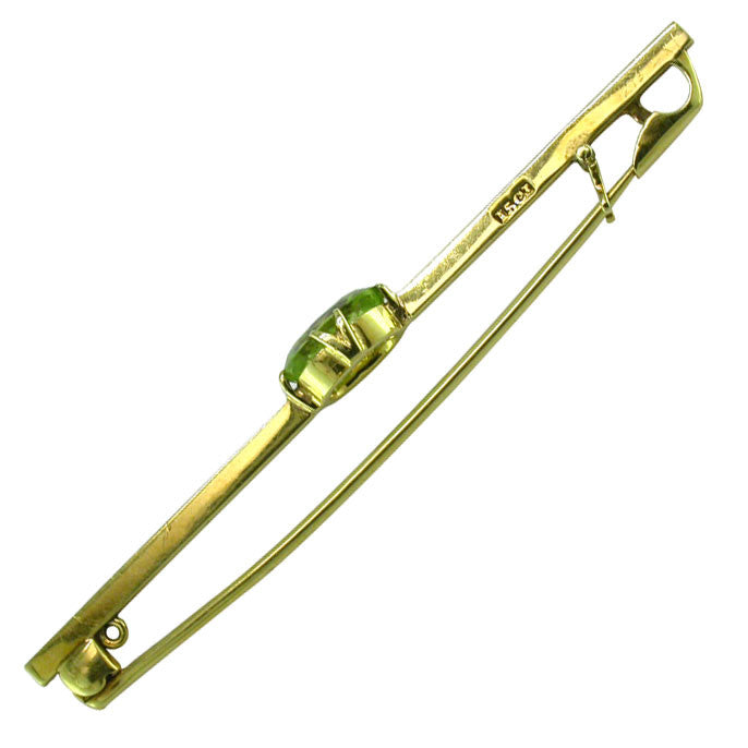 Peridot stock pin, a plain bar set to the centre with a single oval peridot, tested with acid and marked '15ct', circa 1920's with safety catch