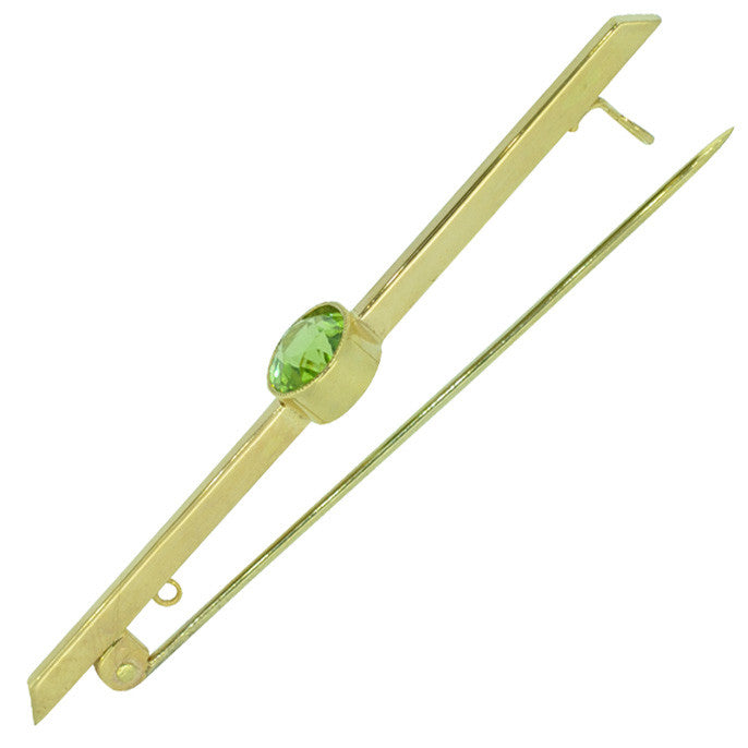 Stock pin set to the centre with a single oval peridot in rub-over setting, marked '9ct' and tested with acid as 9ct rose gold circa 1930's